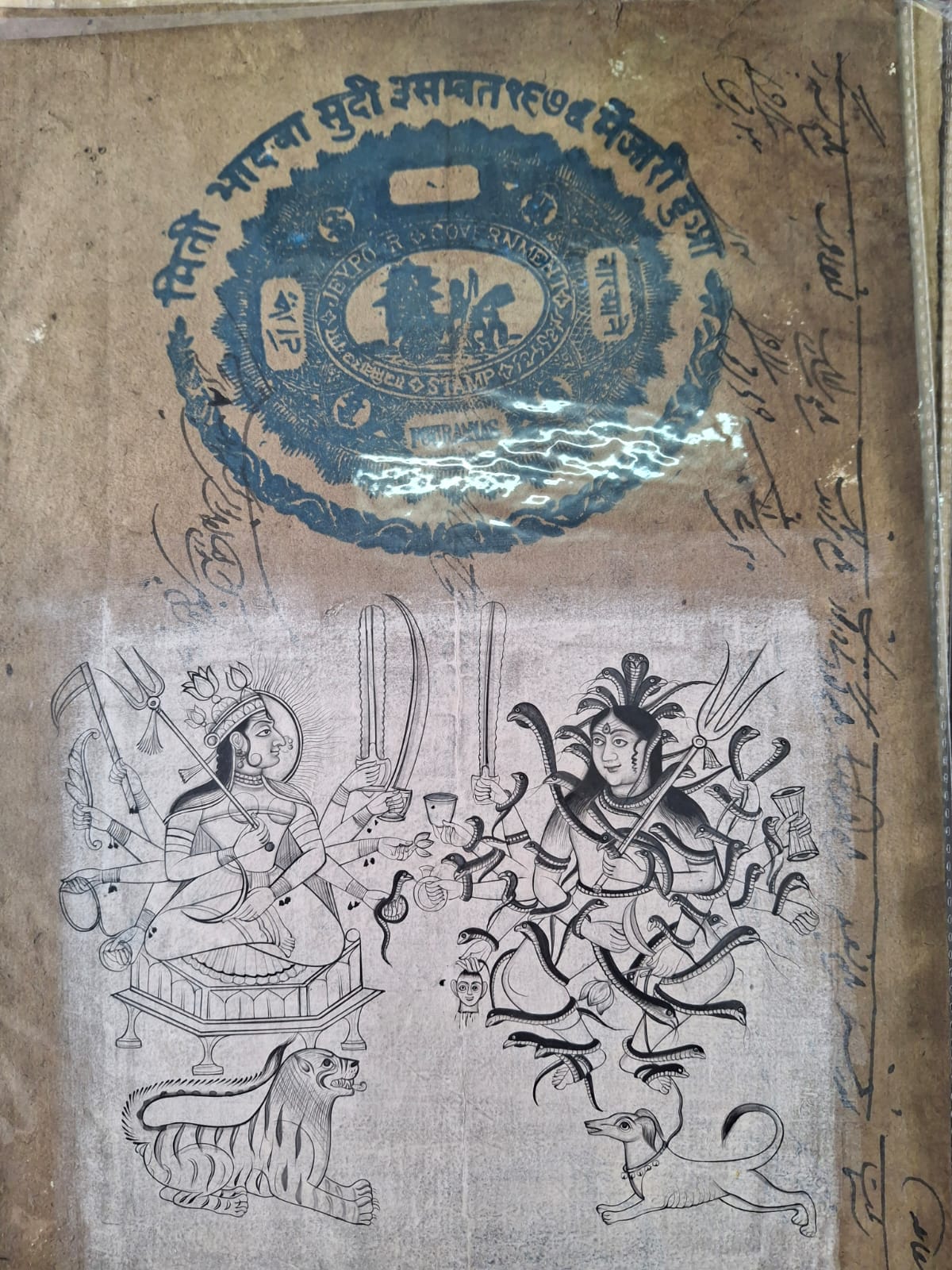 • 100-Year-Old Document: The artwork is painted directly onto genuine antique paper that bears a large, circular legal seal (likely a "Court Fee Stamp") from the Jaipur Royal Family era. The visible script and official markings date the paper itself to approximately 100 years old, providing immense historical value and context.